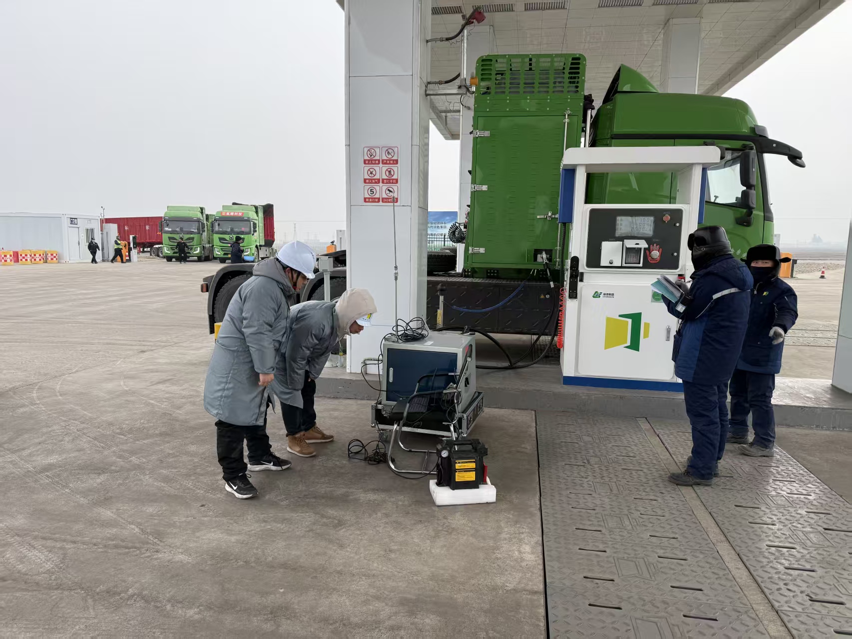 宣力、伊宏兩座加氫站是全球規(guī)模最大氫能提純工廠的核心配套樞紐,淖毛湖鎮(zhèn)深居戈壁腹地,冬季氣候條件惡劣,最低氣溫達零下10攝氏度,風(fēng)沙肆虐、環(huán)境復(fù)雜。面對時間緊、任務(wù)重、環(huán)境險等不利因素,武漢檢測集團計量中心抽調(diào)業(yè)務(wù)精湛、經(jīng)驗豐富的技術(shù)骨干,緊急調(diào)運高精度專業(yè)校準設(shè)備,反復(fù)推演優(yōu)化物流路線,克服低溫環(huán)境下儀器反應(yīng)遲滯、數(shù)據(jù)波動漂移、管路凍堵結(jié)冰等不利影響,通過優(yōu)化操作流程、強化設(shè)備保溫、實時數(shù)據(jù)校驗等多項舉措,高質(zhì)量、高標準完成了全部13臺加氫機的校準任務(wù)。